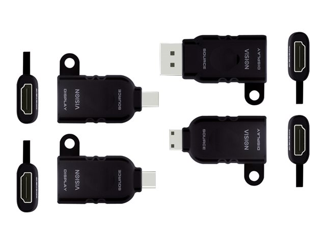 | Inkluderad kvantitet x Typ | HDMI-adapter - 19-stifts mini-HDMI Typ C (hane) till 19 pin HDMI typ A (hona) Videokort - Mini DisplayPort (hane) till 19 pin HDMI typ A (hona) Videokort - 20-stifts DisplayPort (hane) till 19 pin HDMI typ A (hona) Videokort - 24-stifts USB-C (hane) till 19 pin HDMI typ A (hona) |