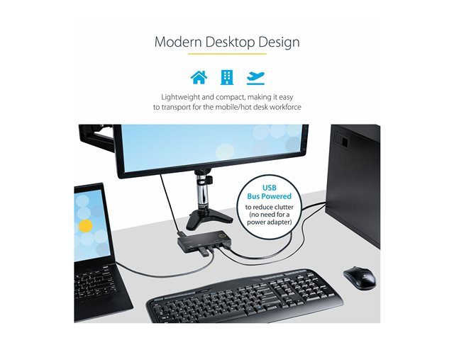 Förutom USB-C-utförandet för lägsta möjliga kabeldragningsbehov är KVM bussdriven, så att man i ännu högre grad slipper trassel då man inte behöver använda en otymplig strömadapter. Tack vare den lätta och lilla formfaktorn är det enkelt att använda den här mini-KVM-switchen som är idealisk för mobil personal.