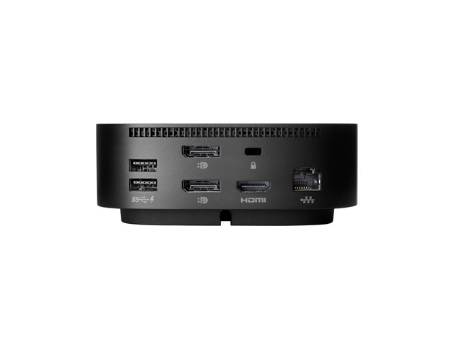 Anslut er USB-C -aktiverade bärbara dator till bildskärmar, tillbehör och trådat nätverk med den mångsidiga, eleganta och utrymmesbesparande HP USB-C -dockningsstationen G5.